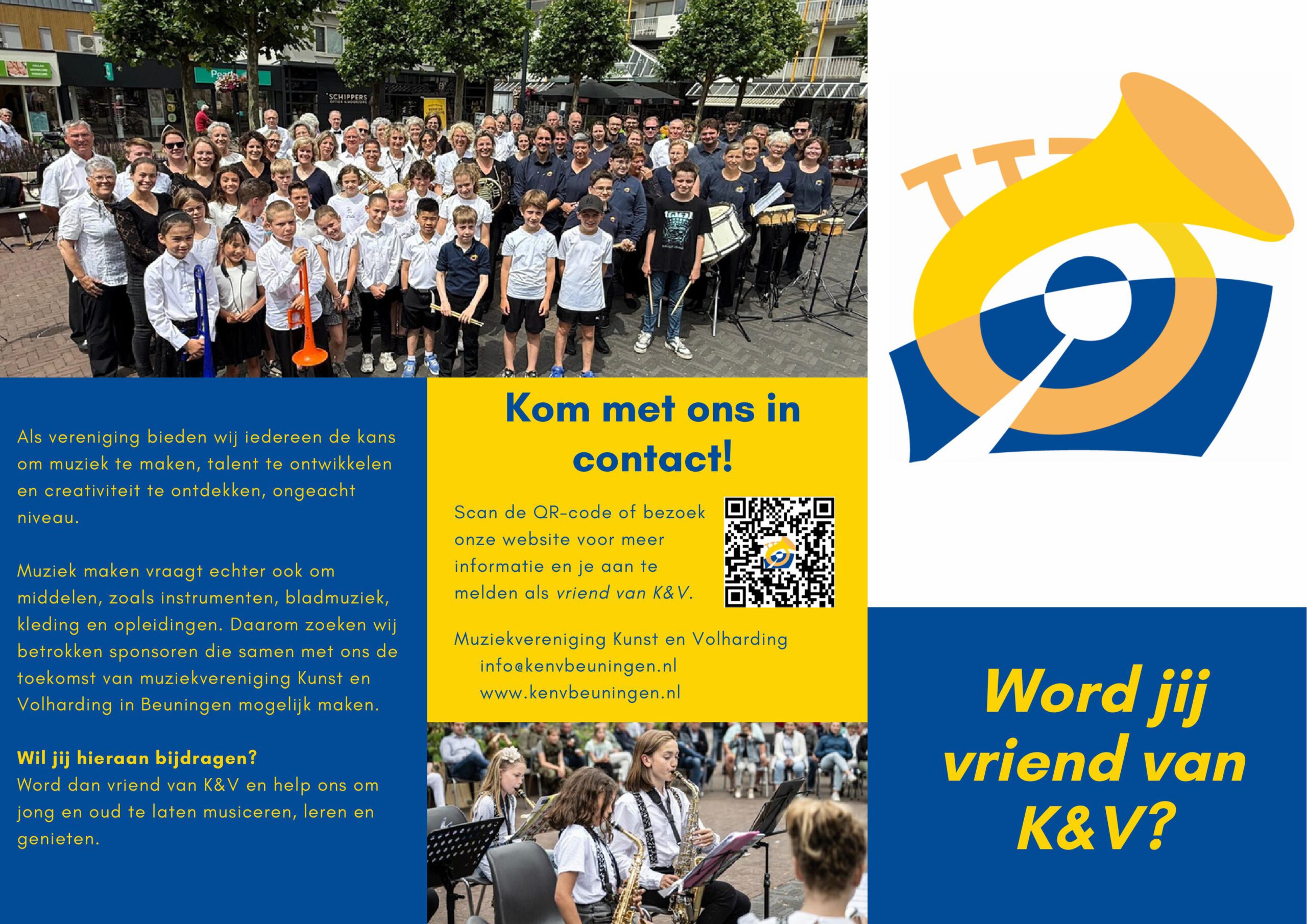 Kunst en Volharding is een muzikaal begrip in de gemeente Beuningen. Al jaren streven wij ernaar onze steen bij te dragen aan het culturele landschap van de gemeente, om iedereen die dat wil de kans te bieden zich te ontwikkelen als muzikant. Om dit voor te toekomst te behouden kunnen we de hulp van sponsoren en donateurs goed gebruiken.