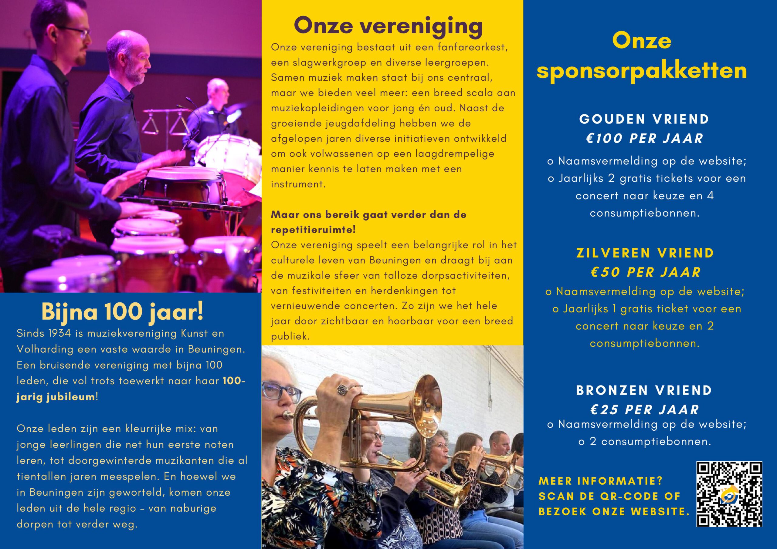 Door sponsorbijdragen kunnen we het kostbare instrumentarium in goede staat houden en indien nodig nieuwe instrumenten aanschaffen. Ook kunnen we door sponsoring investeren in onze muziekopleiding en in het organiseren van concerten en evenementen, waar u en Beuningen dan weer van mee kunnen profiteren.